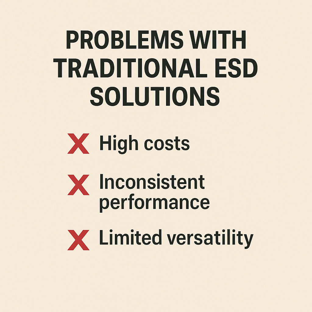 Most ESD paints rely on carbon or metal fillers for conductivity. These fillers wear down, clump, or flake, creating patchy protection, contamination risks, and compliance issues in sensitive environments. The paints themselves are expensive—and frequent reapplication only multiplies lifecycle costs.