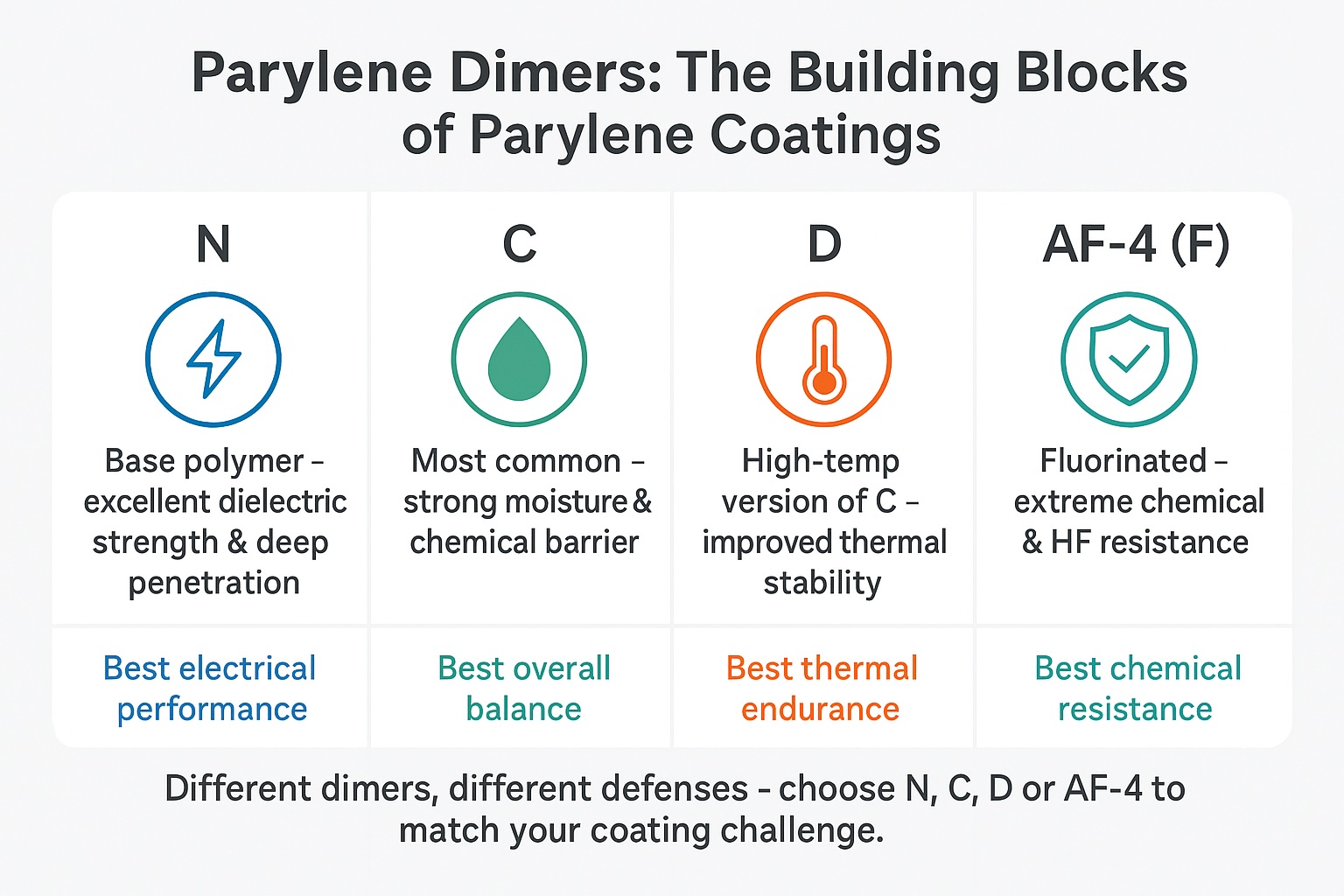Educational infographic summarising how Parylene N, C, D and fluorinated AF-4 dimers differ in dielectric strength, moisture barrier, temperature stability, and chemical resistance.