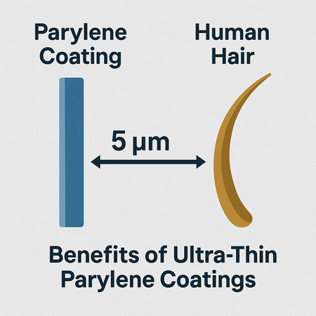 This infographic shows the benefits of ultra-thin Parylene coatings by comparing a 5µm Parylene film to the thickness of a human hair (~75µm), highlighting its invisible yet powerful protection.