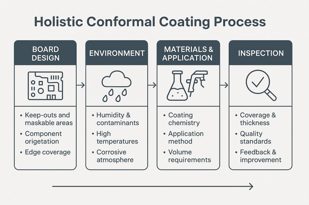 In most cases, they aren’t random at all — they are symptoms of a process that was never aligned from the start. Conformal coating only works reliably when PCB design, environmental demands, coating chemistry, application method and inspection strategy all work together as a unified system.